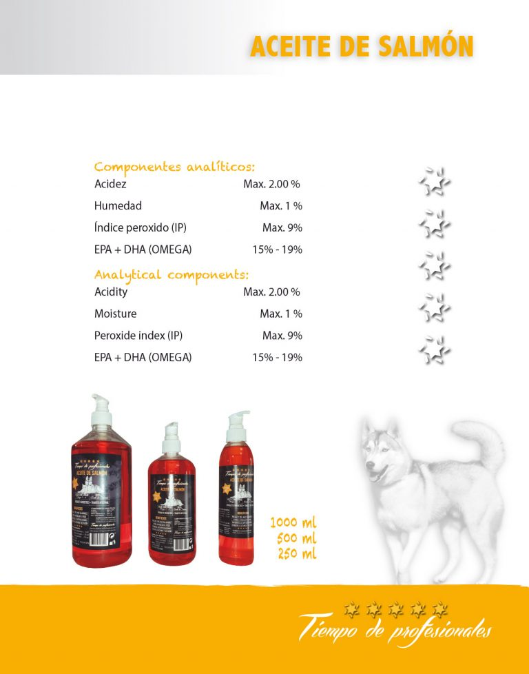 Aceite de salmón con alto contenido en ácidos grasos Omega 3 y 6 con gran poder antioxidante. Especialmente indicado para el crecimiento de cachorros por las propiedades saludables del aceite de salmón (O3 y 06), favorece a los cachorros en crecimiento, perras gestantes, perros inapetentes, ayuda a regular el peso, excepcional para perros con gran actividad por su acción antinflamatoria y salud articular Mejora problemas de piel y pelo dando a su vez calidad en el pelo, suavidad, brillo y acentuando el color del mismo.