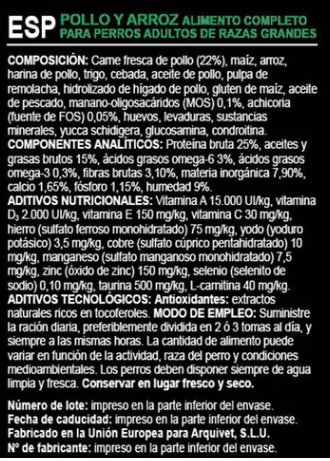 INGREDIENTES: Carne fresca de pollo (22%), maíz, arroz, harina de pollo, trigo, cebada, aceite de pollo, pulpa de remolacha, hidrolizado de hígado de pollo, gluten de maíz, aceite de pescado, manano-oligosacáridos (MOS) 0,1%, achicoria (fuente de FOS) 0,05%, huevos, levaduras, sustancias minerales, yucca schidigera, glucosamina, condroitina.