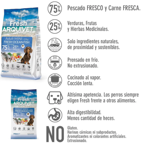 COMPOSICIÓN: 55% pescado fresco, 20% pollo fresco, almidón parcialmente hidrolizado, tocoferoles, aceites esenciales (orégano, tomillo, clavo, romero y canela ceylan), pulpa remolacha molida, calabaza, levadura cerveza, achicoria, piña, pera, manzana, cúrcuma, romero, tomillo.