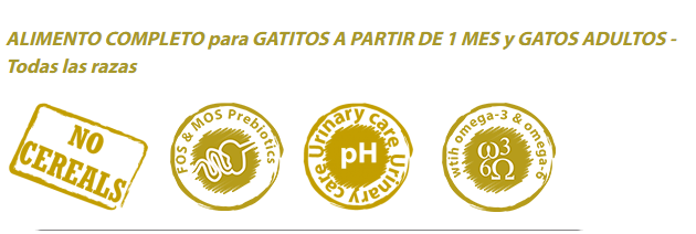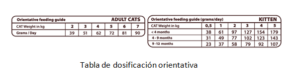 Componentes analíticos: Proteína bruta (37%), Aceites y grasas brutas (20%), Fibra bruta (2,5%), Ceniza bruta (7%), Carbohidratos (21,2%), Calcio (1,2%), Fósforo (1,1%), Magnesio (0,1%), Ácidos grasos omega 3 (0,7%), Ácidos grasos omega 6 (3,1%), Taurina 1.000 mg/kg, Metionina 1.000 mg/kg.